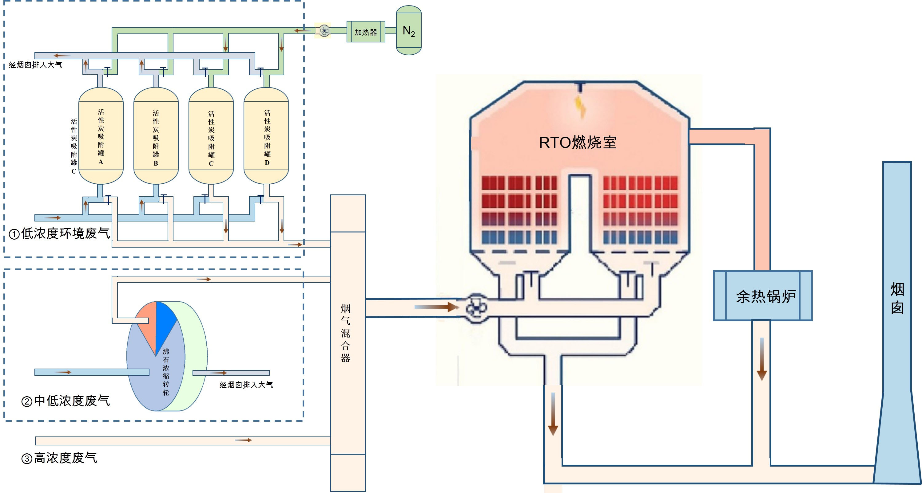 对于车间内的低浓度、大风量的VOCs环境废气(100mg/m3以下),首先采用活性炭吸脱附装置对废气进行浓缩,浓缩后进入RTO进行热氧化处理。该工艺采用目前先进的氮气保护脱附的技术,具体的过程为: